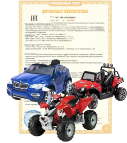 当然,电动车是一种玩具,属于技术法规TR EAEU 008/2011 "关于玩具的安全 "的范畴。但电压超过24伏的电动汽车和定位为公共用途的玩具除外。大多数儿童电动车的工作电压最高为24伏。至于第二点这完全取决于电动车的描述和技术数据。
